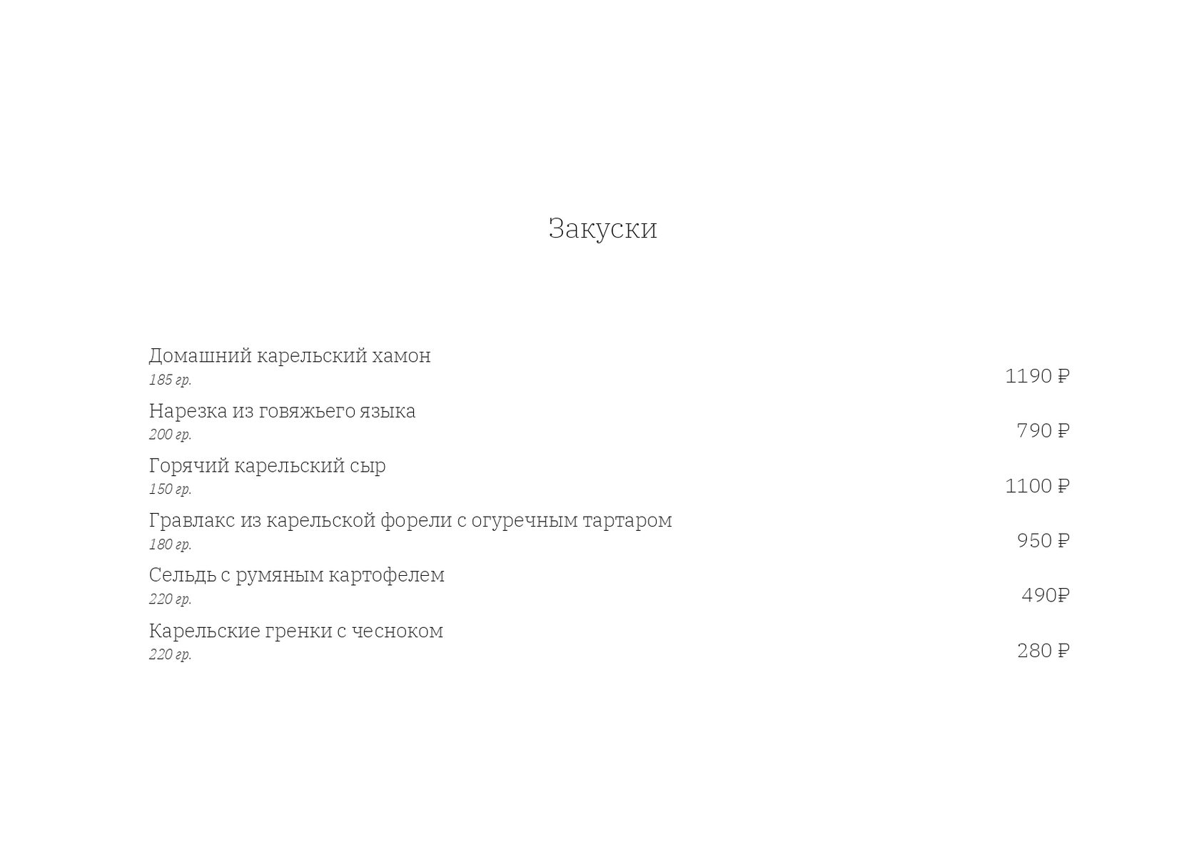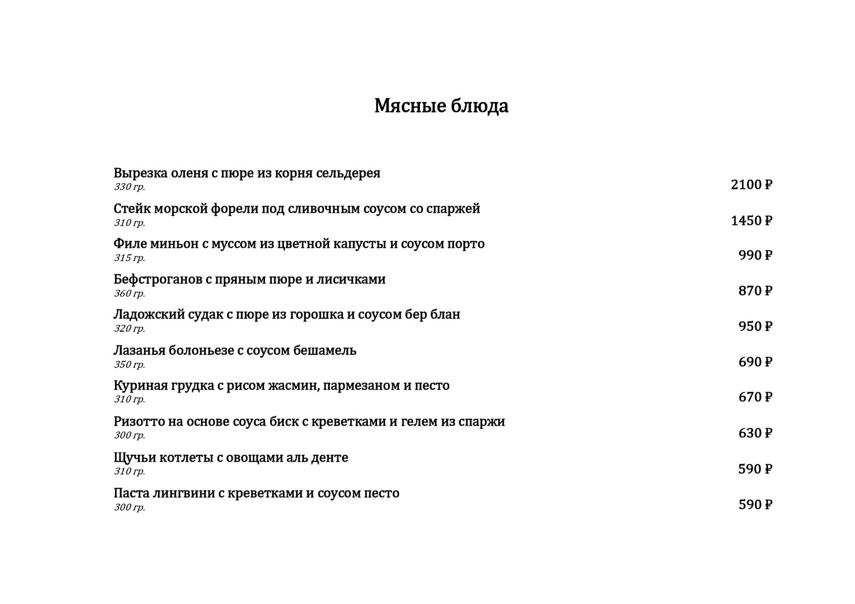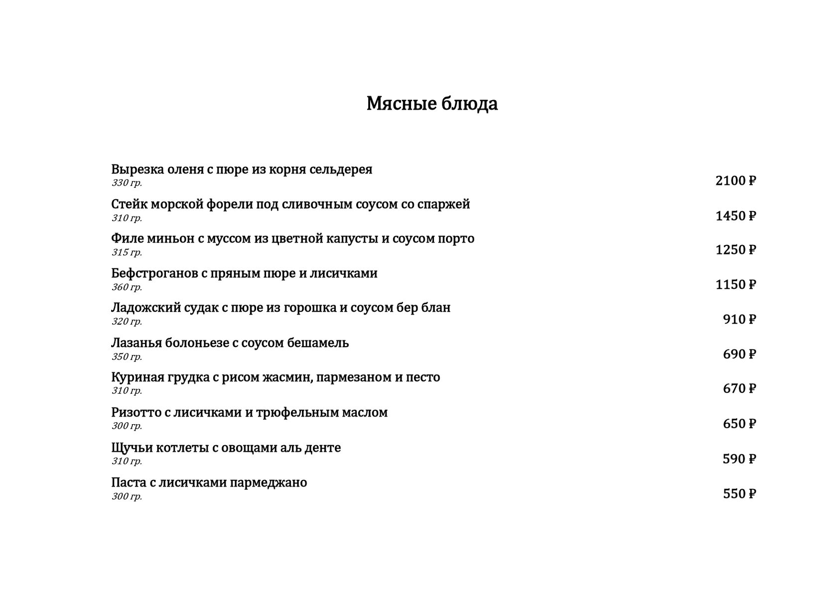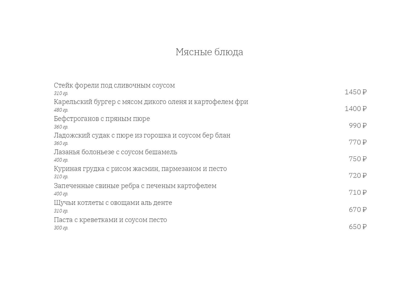 — Мясные блюда. В меню мясных блюд вы найдете как позиции из карельской дичи, так и из всеми любимых курицы и говядины. Каждое блюдо продумано до мелочей, а сочетание вкусов приятно удивит любого гурмана.