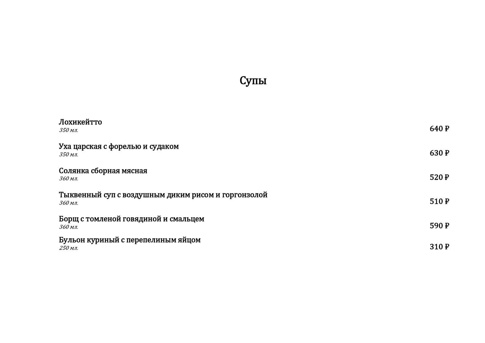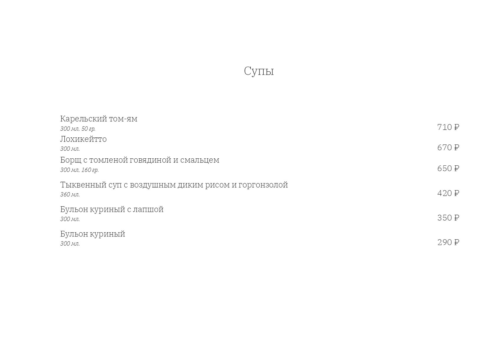 — Супы. Наши супы — это домашнее тепло и уют. Бульоны, традиционный северный лохиккейто, мясные и овощные супы — каждая ложка дарит гастрономическое наслаждение.